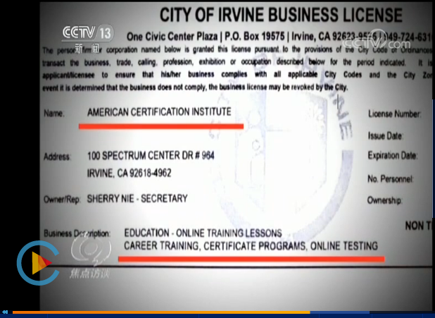 2、访谈采访了加州政府的官员阐述了几点问题(一)ACI美国认证协会最早成立于2003年,是真实存在的协会组织,并且在美国有在线教育、在线考试测评和认证的许可范围。(请见以下图片红线处)(二)ACI所颁发的证书不是心理咨询行业的从业资格证,即便在美国只有获得博士学位,才能正式从事心理咨询师的工作对外提供服务。